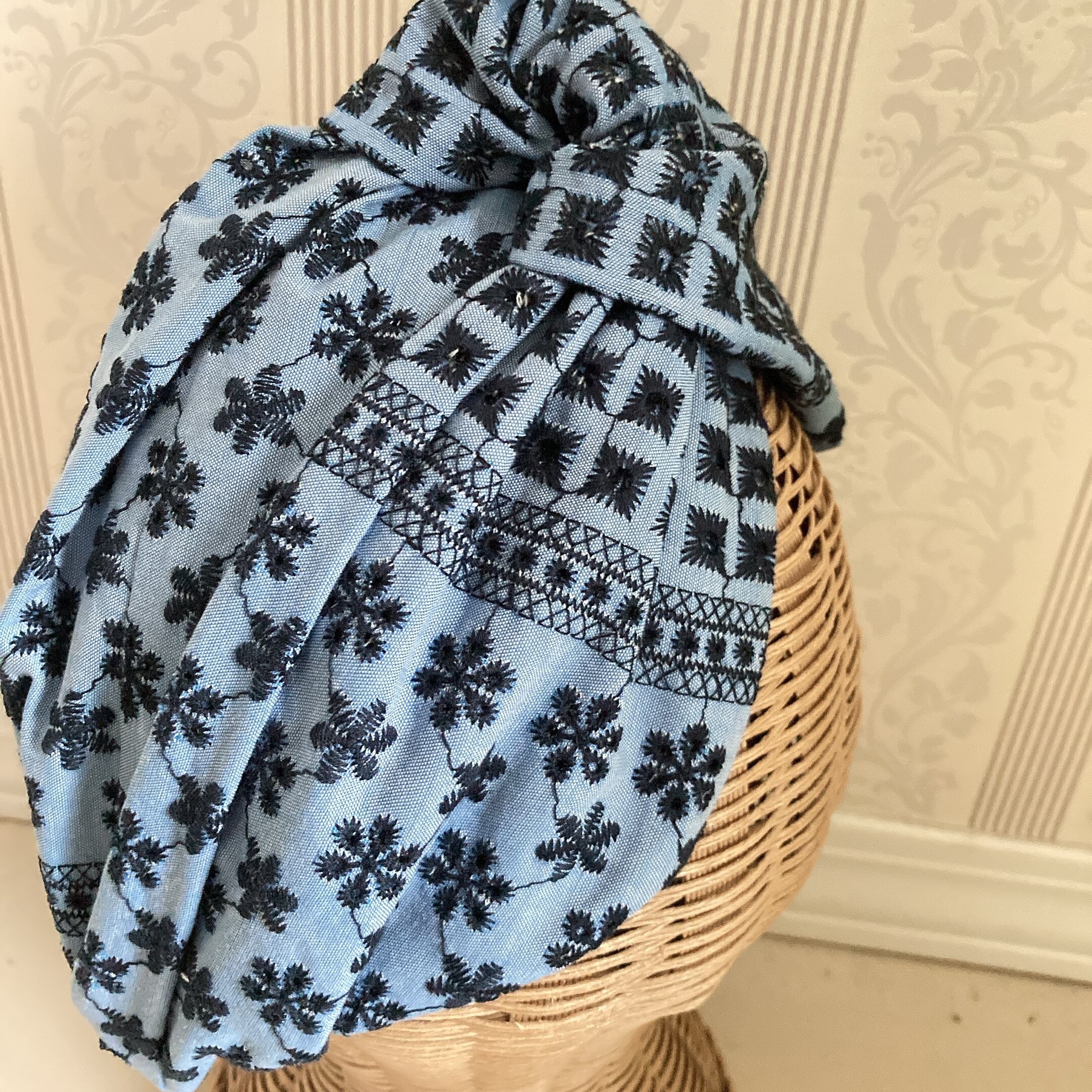 ブルーのダンガリー生地にネイビーの刺繍が入った生地です。